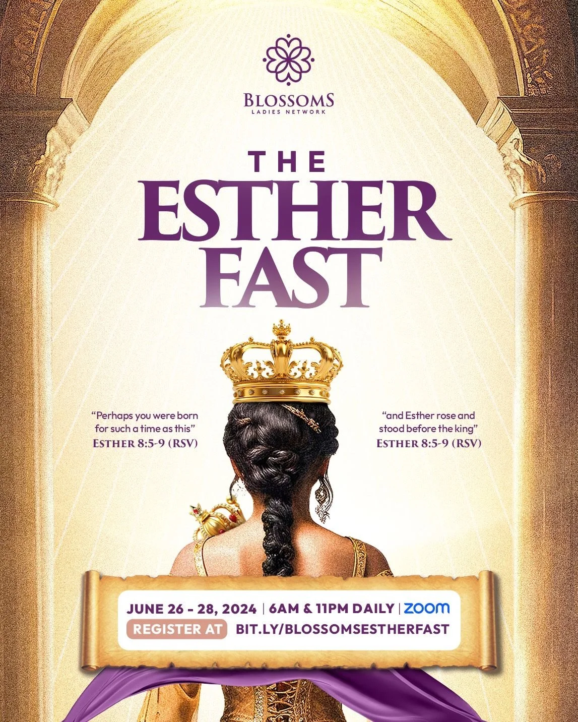 To attend, register via bit.ly/BLOSSOMSESTHERFAST. Isaiah 58:5-12 - “Is not this the kind of fasting I have chosen: to loose the chains of injustice and untie the cords of the yoke, to set the oppressed free and break every yoke?” This is a date with the King! A date with Destiny!